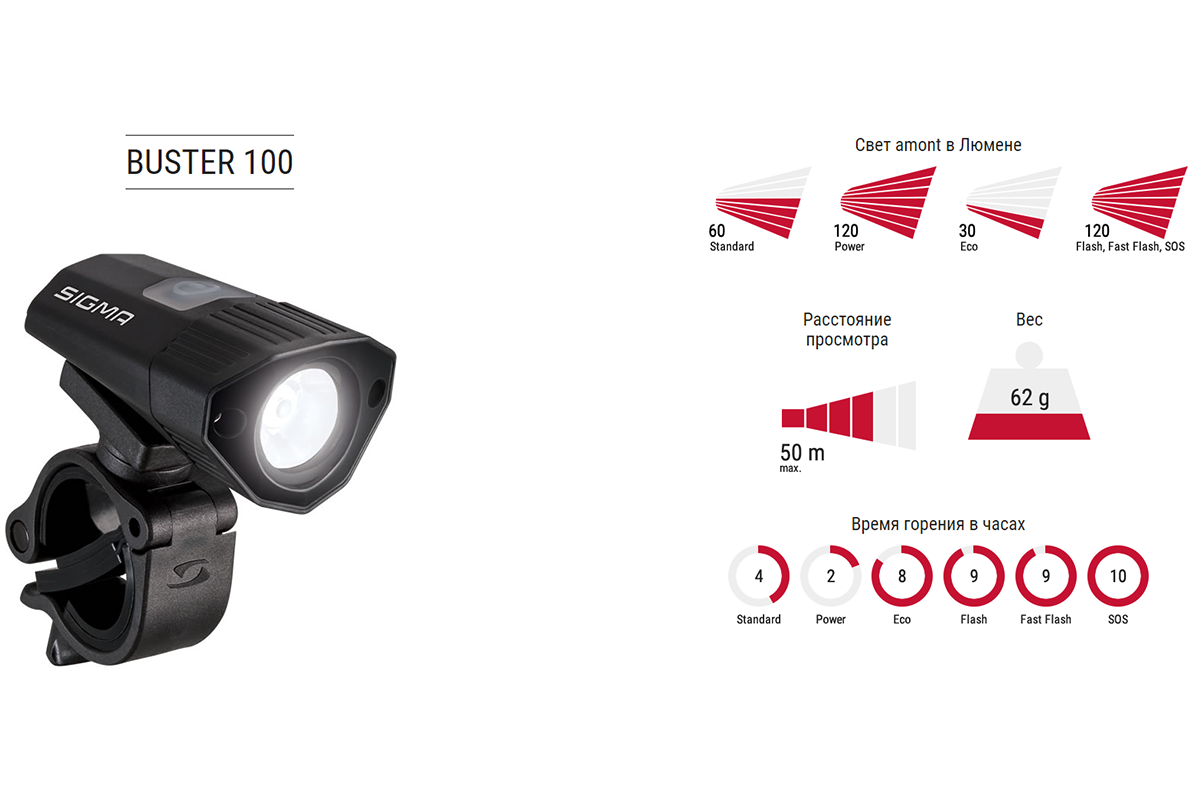 Фонарь передний, 1 светодиод, световой поток 120 Lumen, Li-Ion аккум,USB, черный. Вес 62 грамма. Шесть режимов работы. Дальность луча 35 метров.ХарактеристикиБренд SIGMA Модель BUSTER 100 Год Без года Световой поток в люменах да Источник света да