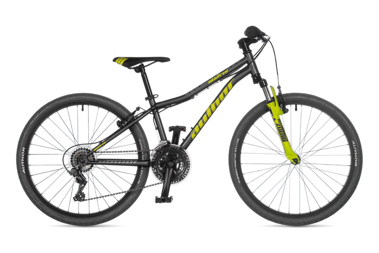 Подростковый велосипед Велосипед Author Matrix 24 (2024) Отлично подходит для юных райдеров. Диаметр колёс составляет 24" дюйма(ов), что оптимально для детей в возрасте от 9 до 15 лет. На велосипеде установленны надежные Ободные (V-brake) тормоза, это позволяет использовать его для прогулочного катания по различным типам дорог. Яркая расцветка и лаконичный дизайн не оставит равнодушными даже самых притязательных велолюбителей. Купить подростковый велосипед Велосипед Author Matrix 24 (2024) по разумной цене можно в интернет-магазине ВелоШоп.ХарактеристикиБренд AUTHOR Модель 24 Matrix Год 2024 Серия Matrix Материал рамы Сталь (Hi-Ten) Рама/описание hi-ten 24 Тип вилки Амортизационная (пружина) Вилка/регулировки ZOOM (40 mm) Диаметр колес 24" Обода alloy 32 holes Резина AUTHOR Speed Master 24' ? 1.75 Тормоза Ободные (V-brake) Тормоз TEKTRO V Уровень оборудования Любительский Шифтеры SHIMANO Revoshift (18) Переключатель передний SHIMANO TY500 (28.6) Переключатель задний SHIMANO TY200 Кассета SHIMANO MF-TZ510-6 14-28 (6) Цепь KMC Z6 Каретка VP COMP cartridge Шатуны PROWHEEL 42-34-24 teeth 152 mm cranks Количество скоростей 18 Руль steel 20 mm 580 mm Рулевая колонка PRESTINE 1-1/8 Вынос Alloy Седло AUTHOR Подседельный штырь alloy (25.4) Педали resin Втулка передняя steel 32 holes Пол/возраст Мужской Грипсы длина/тип AUTHOR kratton rubber