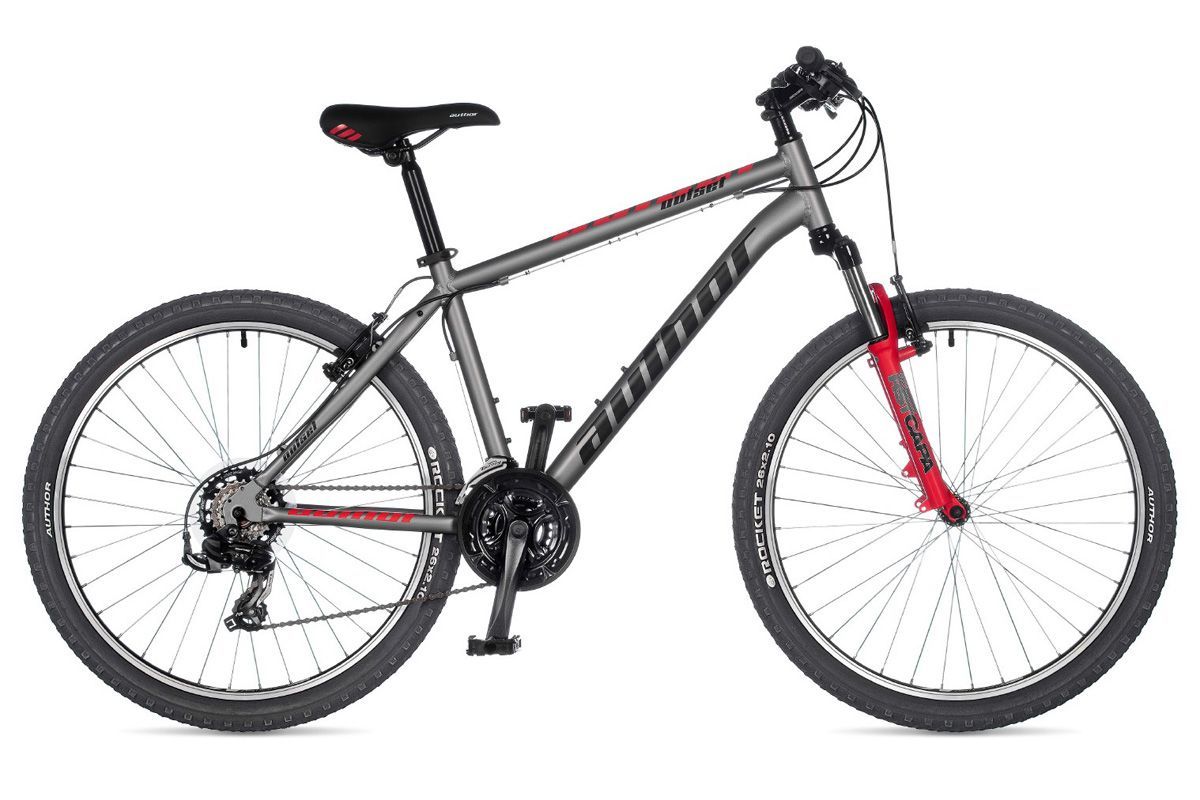 Велосипед AUTHOR Outset (2023) — маневренная модель с ярким дизайном, надежная, отзывчивая, с прекрасными скоростными характеристиками. Отлично показала себя на разных типах покрытий, поэтому подойдёт и для поездок по городу, и для вылазок на природу. Горный велосипед 2023 года, имеющий колеса 26 (стандарт), легко управляется, и для разгона ему не требуется много времени. Ободные (V-brake) тормоза гарантируют высокую степень безопасности и успешное совершение любых маневров даже на сложных участках пути. Колеса диаметром 26" дюймов и прочная рама позволяют байку выглядеть внушительно и солидно.ХарактеристикиБренд AUTHOR Модель 26 Outset Год 2023 Серия Outset Материал рамы Алюминий (Alloy) Рама/описание alloy 6061 26' Тип вилки Амортизационная (пружина) Вилка/регулировки RST Capa 26 T (80 mm) Диаметр колес 26" Обода alloy 36 holes Резина AUTHOR Rocket 26' ? 2.10' Тормоза Ободные (V-brake) Тормоз TEKTRO V Уровень оборудования Любительский Шифтеры SHIMANO (21) Переключатель передний SHIMANO TY500 (34.9) Переключатель задний SHIMANO TY500 Кассета SHIMANO MF-TZ510 14-34 (7) Цепь KMC Z7 Каретка VP COMP cartridge Шатуны PROWHEEL 42-34-24 teeth 170 mm cranks Количество скоростей 21 Руль steel 20 mm 640 mm Рулевая колонка PRESTINE 1-1/8' Вынос ZOOM alloy Седло AUTHOR Подседельный штырь alloy (31.6) Педали resin Пол/возраст Мужской Грипсы длина/тип AUTHOR high density foam